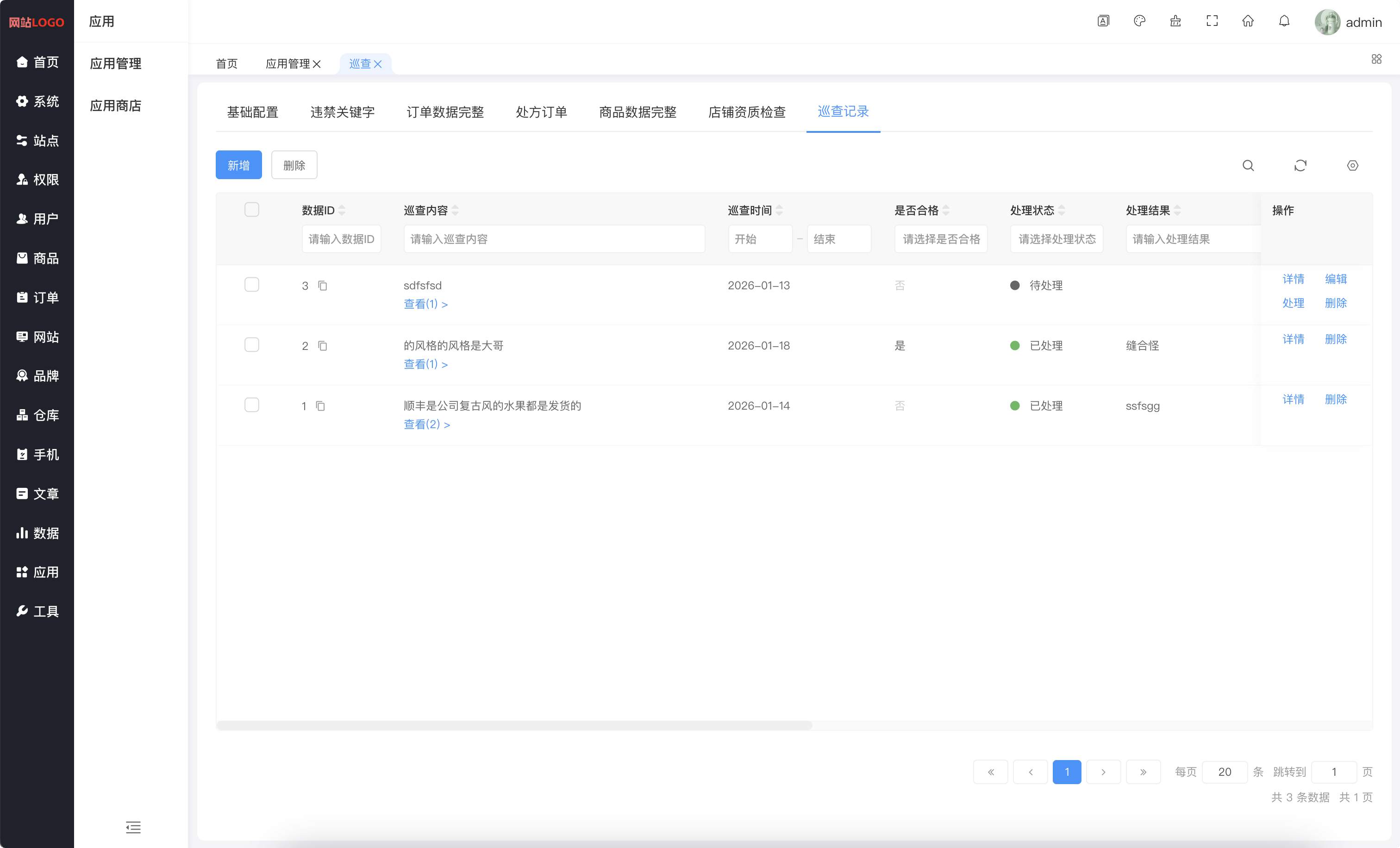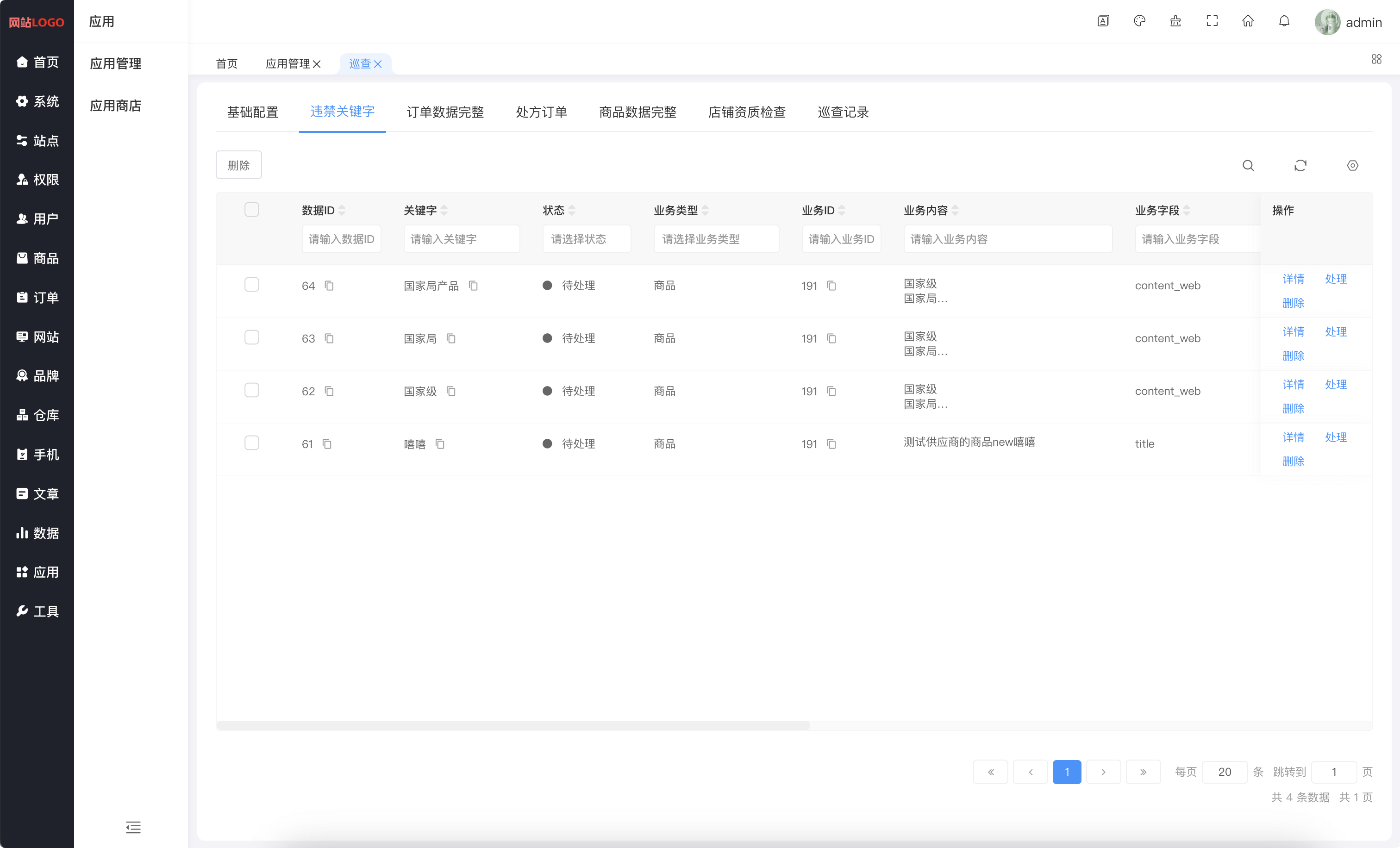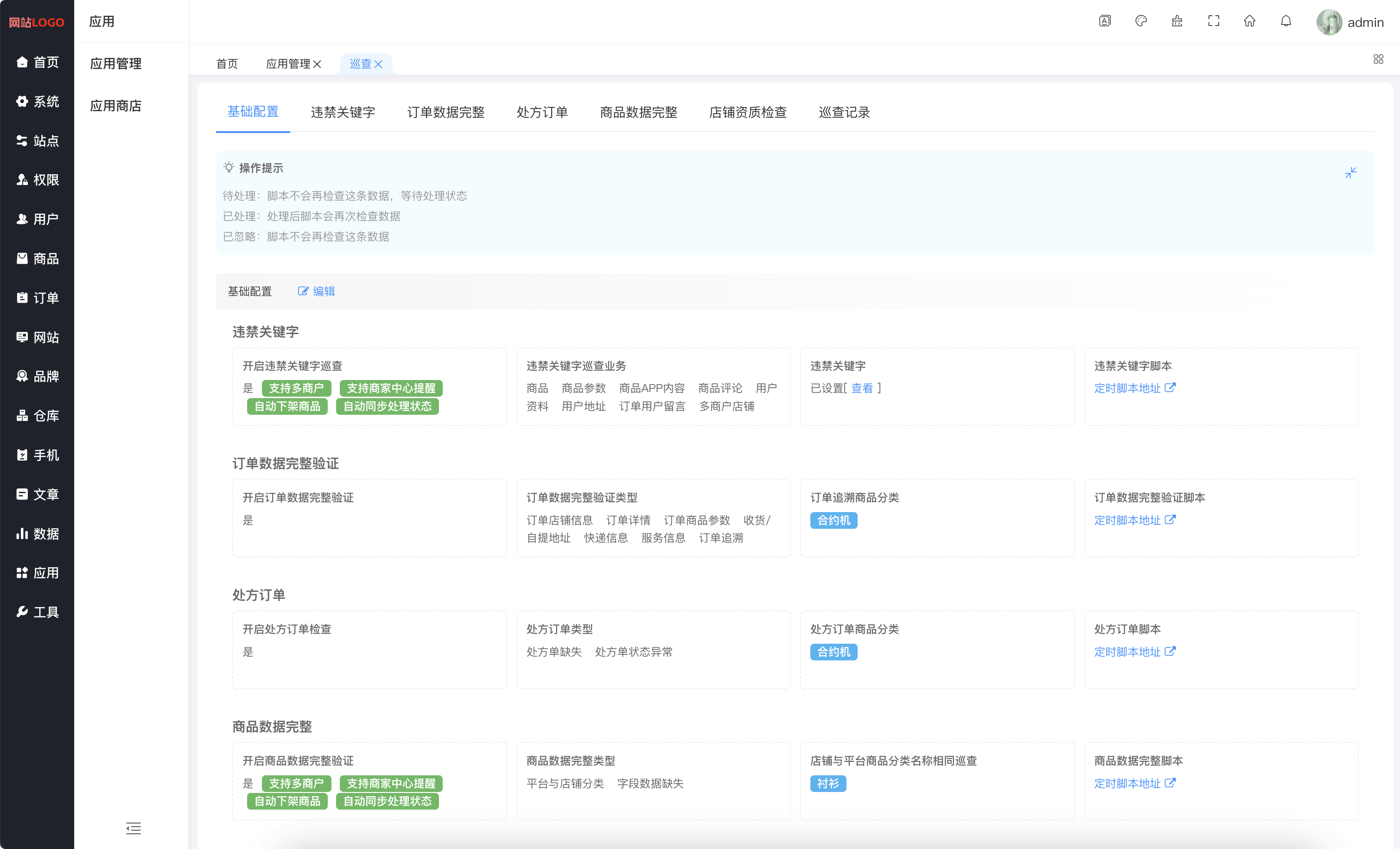 系统内容安全巡查(违禁关键字检查,订单数据完整,处方订单,商品数据完整,店铺资质检查,巡查记录)